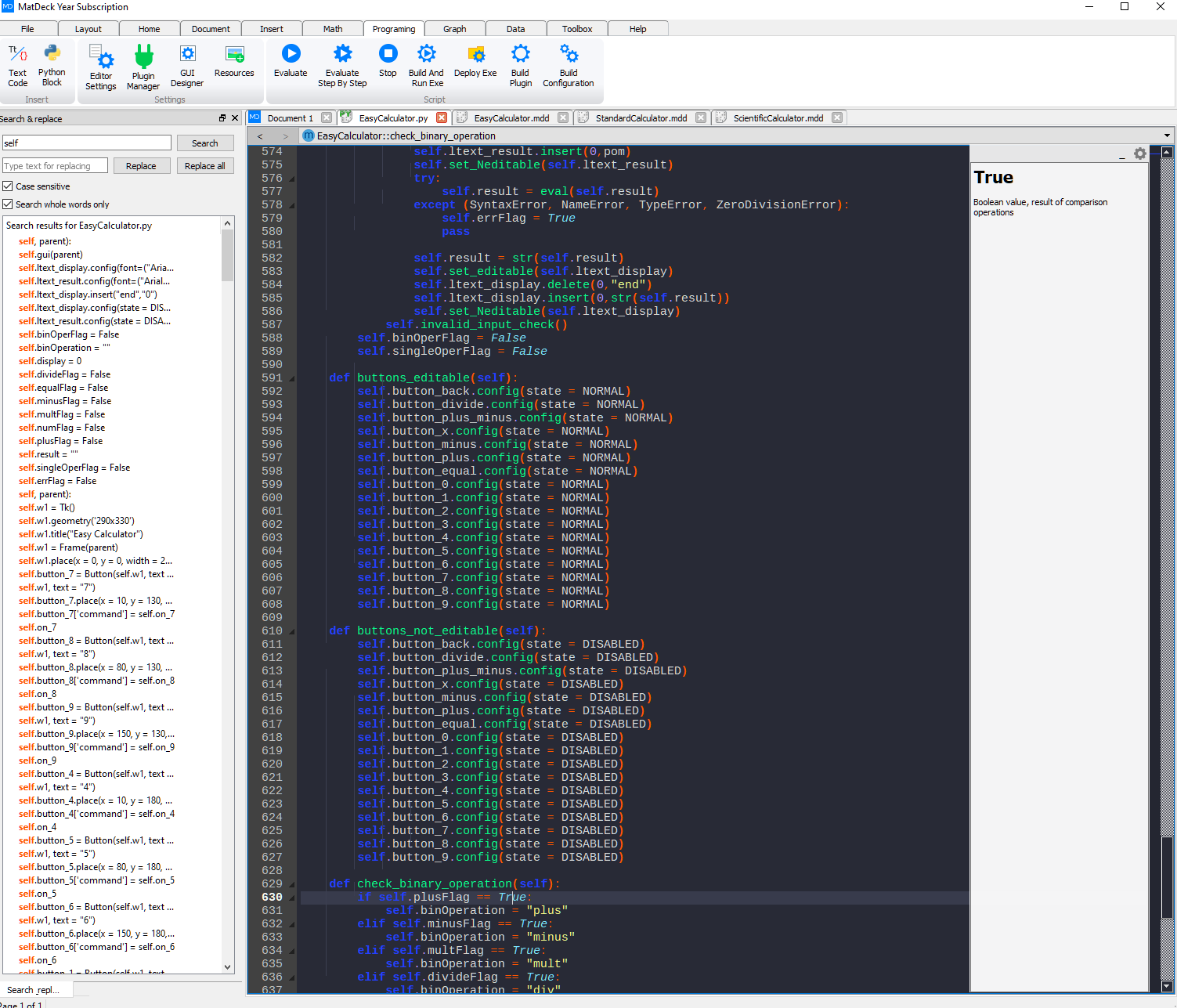 Hình ảnh bên dưới, hiển thị một IDE Python. Loại tài liệu MD này không thể kết hợp mã code, chỉnh sửa văn bản và phương trình toán học trong một tài liệu duy nhất. Tuy nhiên, nếu cần, mã Python code có thể được gọi vào tập lệnh MatDeck script để cho phép sử dụng tất cả các tính năng.